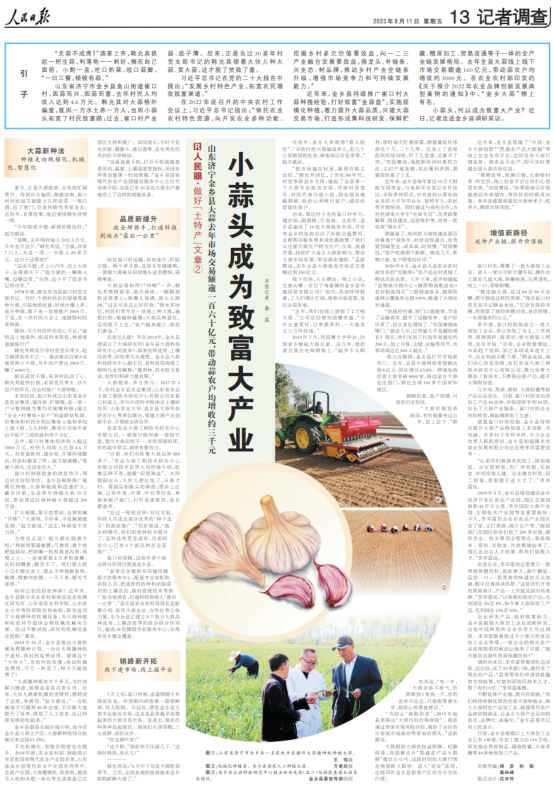 8月11日,《人民日報》整版刊發題為《小蒜頭成為致富大產業》的報道。文章指出,水發農業集團權屬公司金鄉縣和福隆水發農業發展有限公司研發黑蒜、蒜汁等產品,延伸產業鏈,提升價值鏈,打造增值新路徑。